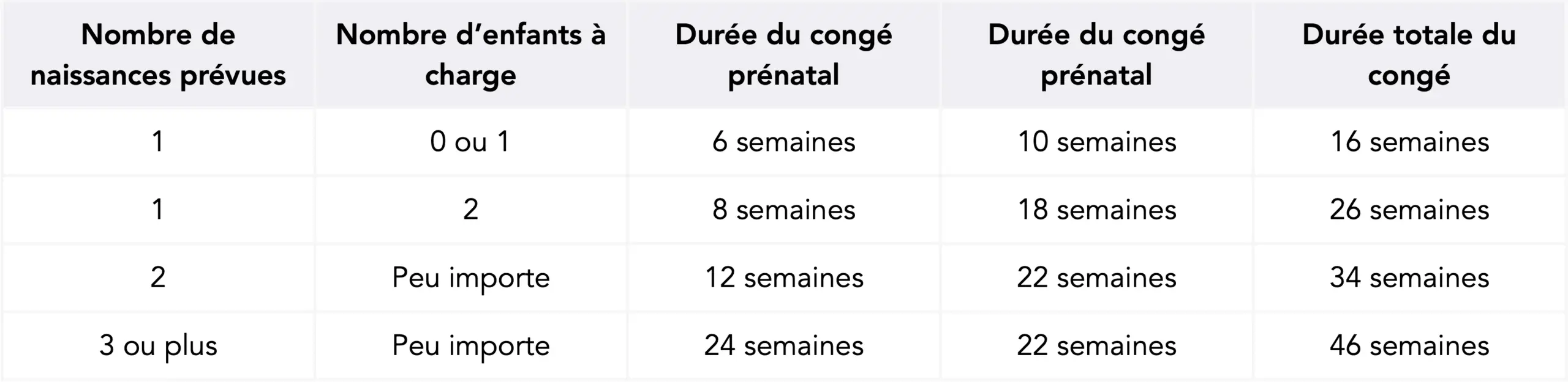 Le congé maternité comprend un congé prénatal (avant la date présumée d’accouchement) et un congé postnatal (après la date présumée d’accouchement), dont la durée varie selon le nombre de naissances prévues et le nombre d’enfants déjà à charge.